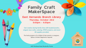 Get creative during family time with beaded jewelry, origami, lace crafts, coloring, STEM projects, and more! All supplies provided. This program ...