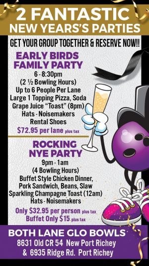 Early Birds Family New Years Party: 2.5 hours of bowling 6:00pm - 8:30pm Up to 6 people per lane Large 1 topping pizza, soda, ...