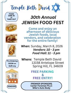 Please join us for our 30th annual Jewish Food Fest! We will have a variety of Jewish foods and baked goods ...