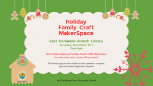 Get creative during our holiday Family Craft MakerSpace. Hot chocolate and cookies will be served. All supplies provided. This program is ...